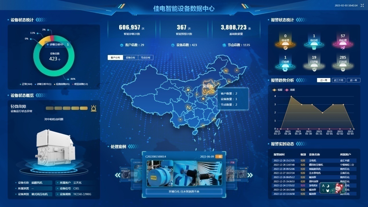 佳電股份形成了以6大系列智能高效異步電動(dòng)機(即YE5、YBX5、YBX3、YJKK/YJKS、YXKK/YXKS、YBF)和1類(lèi)永磁同步電動(dòng)機為主的“6+1”智能高效電動(dòng)機板塊,為電動(dòng)機行業(yè)向高端化、智能化、綠色化轉型做出示范引領(lǐng)。佳電股份不僅是一家專(zhuān)業(yè)的先進(jìn)電機產(chǎn)品制造商,也是工業(yè)設備智能運維整體解決方案的提供商。工業(yè)設備狀態(tài)監測與故障診斷系統產(chǎn)品,通過(guò)對設備運行的物理參數進(jìn)行采集、篩選、傳輸和數據分析,感知設備的運行故障及其變化趨勢,為設備運維管理決策提供數據支撐,實(shí)現工業(yè)設備的預測性維護,提高生產(chǎn)過(guò)程的連續性、可靠性和安全性,是企業(yè)降本增效的“殺手锏”。