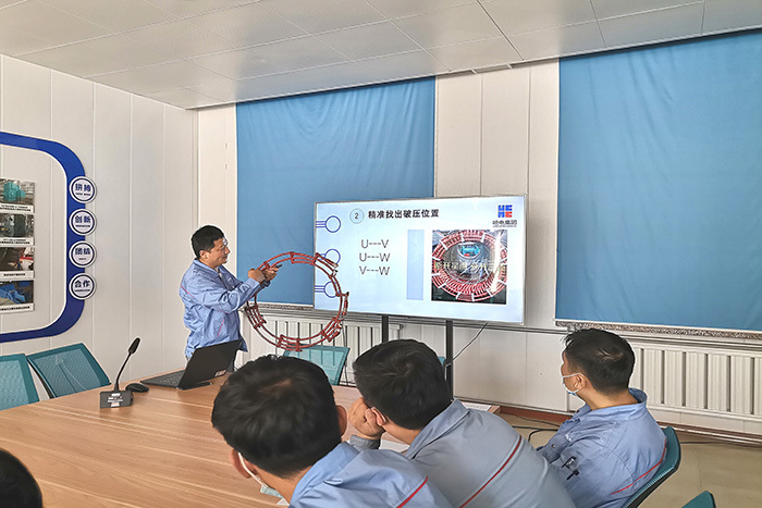佳電股份高級技師、電工車(chē)間接線(xiàn)工成明坤以實(shí)際案例向職工詳細講解了繞組接線(xiàn)的重要性以及常規三相接線(xiàn)圓圖的繪制,通過(guò)自己制作的接線(xiàn)線(xiàn)路實(shí)物,詳細地向大家分享了快速尋找破壓點(diǎn)的小竅門(mén),僅需要一個(gè)萬(wàn)用表和一把斷線(xiàn)剪,通過(guò)分相→分組→分頭就能快速找到故障位置。