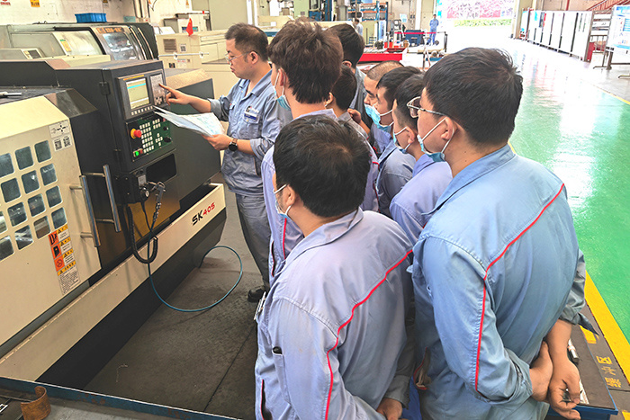 佳電股份技師、屏蔽車(chē)間數控車(chē)工吳先聞在數控車(chē)床前,有針對性地圍繞識圖基礎、刀具選擇,數控刀具涂層材料區別以及切削用量等方面進(jìn)行實(shí)操培訓,并對操作過(guò)程中的常見(jiàn)問(wèn)題進(jìn)行分析講解,促進(jìn)產(chǎn)品質(zhì)量和生產(chǎn)效率提高。