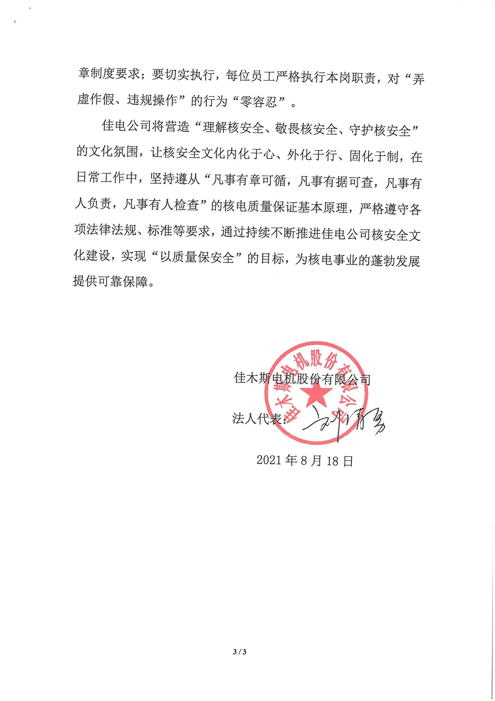 《佳木斯電機股份有限公司核安全文化政策聲明》