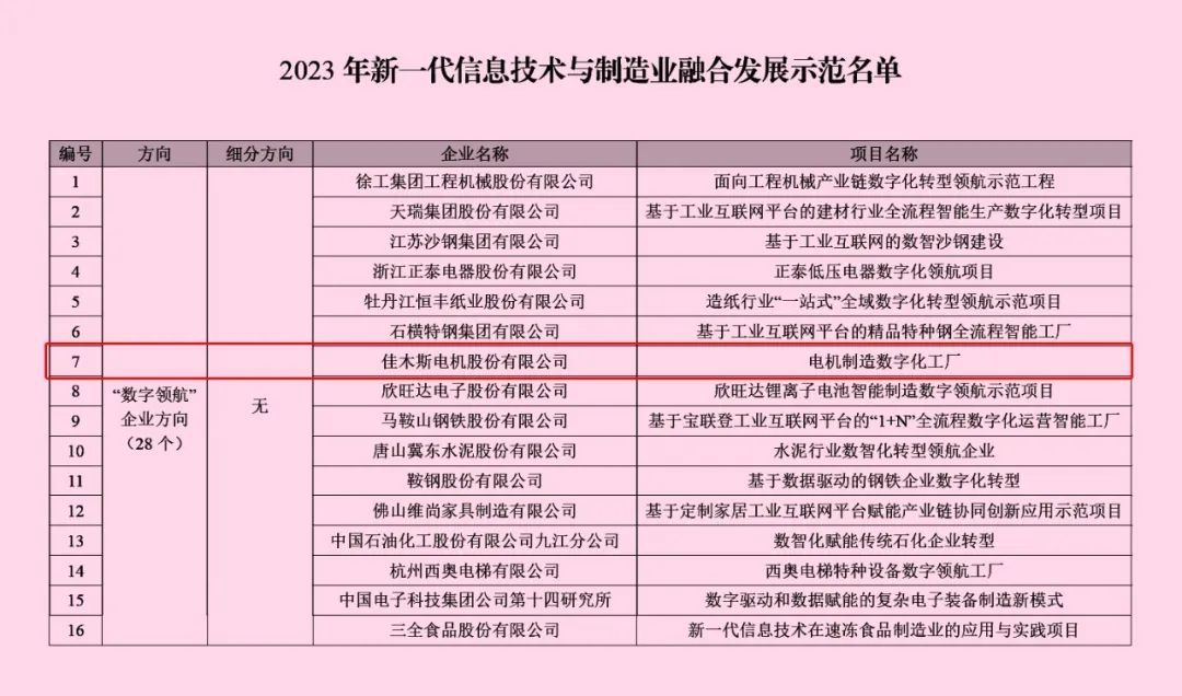 近日,工業(yè)和信息化部辦公廳公布了2023年新一代信息技術(shù)與制造業(yè)融合發(fā)展示范名單,在“數字領(lǐng)航”企業(yè)方向,哈電集團佳電股份申報的“電機制造數字化工廠(chǎng)”項目成功入選,這是哈電集團佳電股份在數字化轉型和科技創(chuàng )新方面獲得的又一項重大殊榮,...