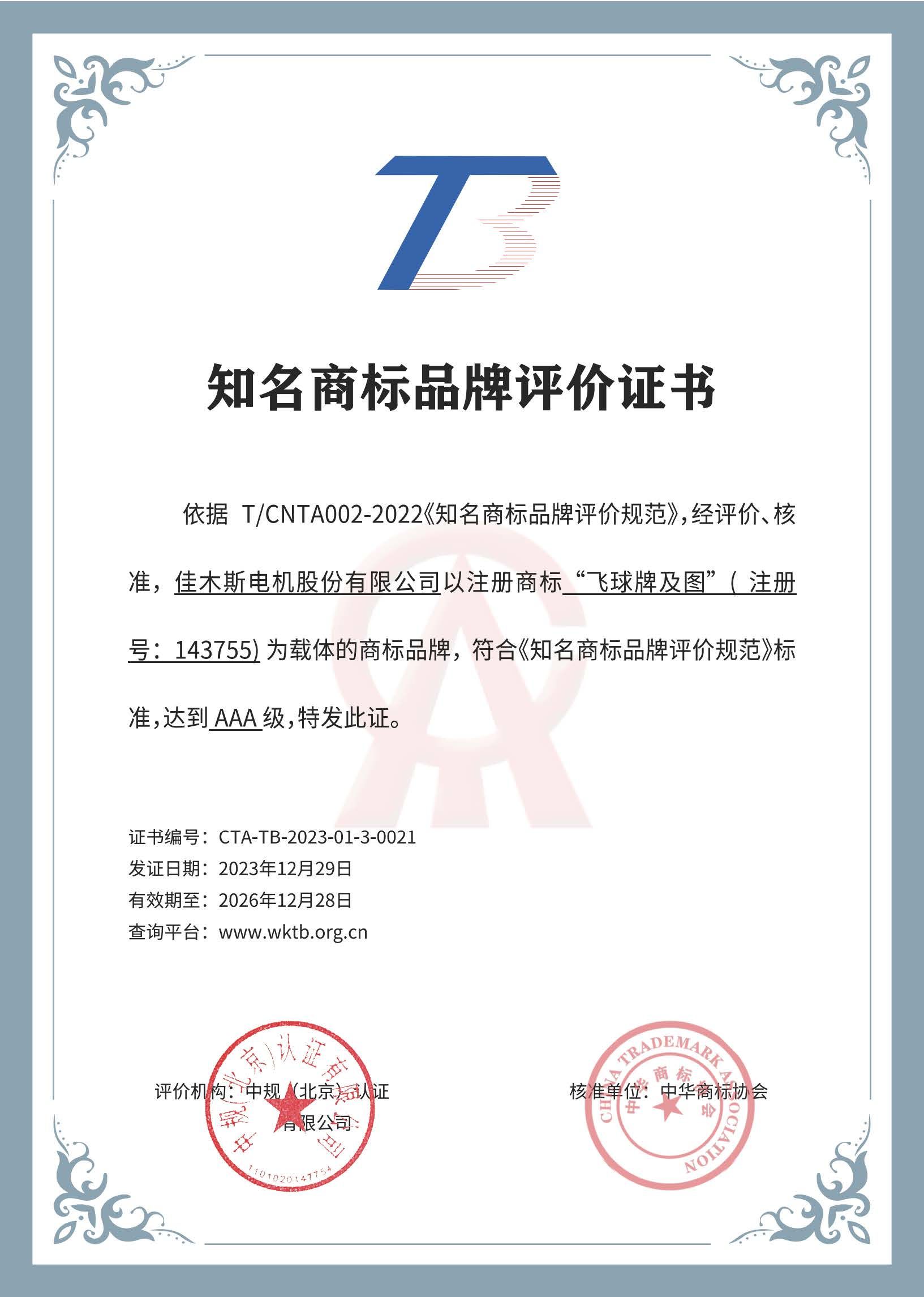 近日,經(jīng)中華商標協(xié)會(huì )和中規(北京)認證有限公司AAA級知名商標品牌評價(jià)審核,哈電集團佳木斯電機股份有限公司(以下簡(jiǎn)稱(chēng)“佳電股份”)“飛球牌”商標順利通過(guò)AAA級(國家級)知名商標品牌認證,成為行業(yè)內首家獲得此榮譽(yù)的單位。...