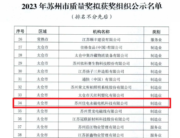 近日,蘇州市質(zhì)量獎評定委員會(huì )公示2023年蘇州市質(zhì)量獎評定結果,蘇州佳電永磁電機科技有限公司(以下簡(jiǎn)稱(chēng)“蘇州佳電”)憑借著(zhù)在戰略規劃、核心技術(shù)構建、經(jīng)營(yíng)理念、質(zhì)量體系等方面的優(yōu)秀表現,經(jīng)過(guò)層層嚴格評審,得到了質(zhì)量評定委員會(huì )的高度認可,獲評“蘇州市質(zhì)量獎”榮譽(yù)稱(chēng)號。